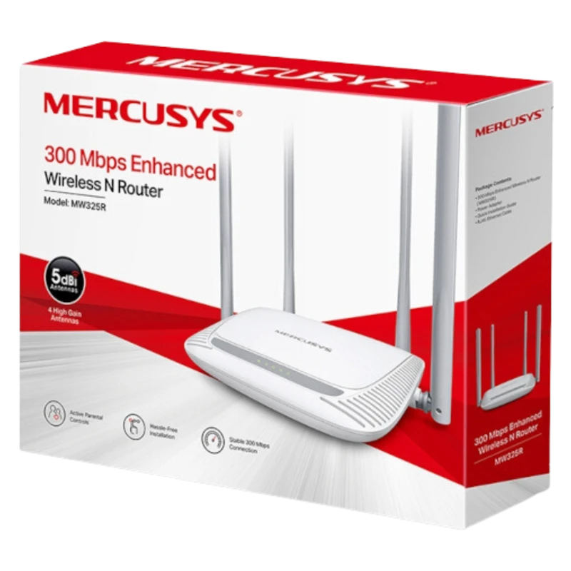 Mercusys MW325R wireless N router has 300 Mbps speed capacity, 200 meter range coverage, 4 omni directional antenna, 4 x 10/100 Mbps LAN port, 1 x 10/100 Mbps WAN port, 2.4 – 2.48 GHz frequency, WEP / WPA / WPA2, WPA-PSK / WPA2-PSK security, 9VDC / 0.6A power supply, 0⁰ C ~ 40⁰ C operation